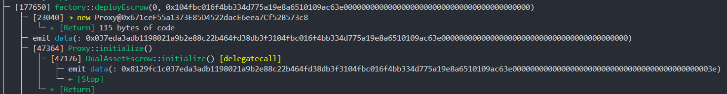 I emitted the calldata during the call to DualAssetEscrow::initialize(), comparing it to args passed to EscrowFactory::deployEscrow()