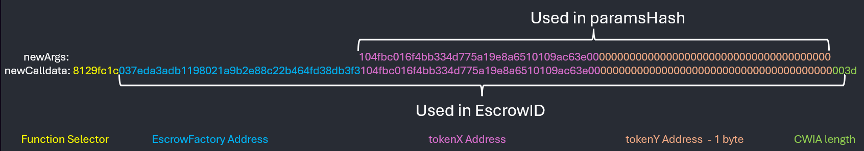 However, we can decrease the calldata length. If we send 1 less byte for tokenY (which are all null bytes as tokenY represents ETH), we are able to get a different paramsHash, whilst having the same EscrowID. This is because the higher byte of CWIA length is used for the last byte during the call to DualAssetEscrow::_getArgAddress(40) which happens to be a null byte as well, thus the same escrowID is produced.